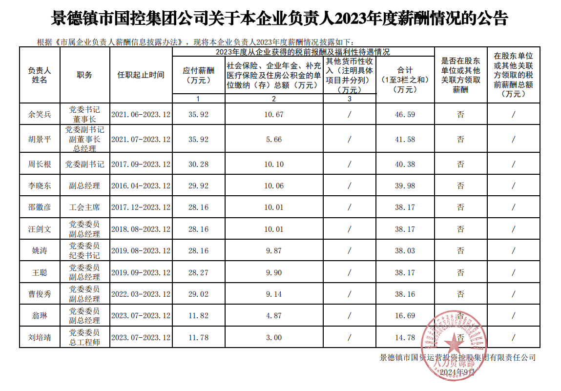 景德鎮(zhèn)市國控集團公司關(guān)于本企業(yè)負責人2023年度薪酬情況的公告